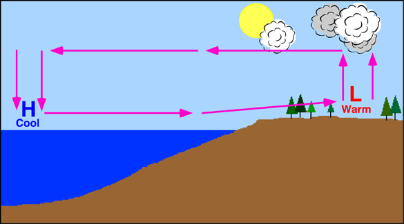 As discussed earlier, winds blow because of differences in atmospheric pressure. Pressure gradients may develop on a local to a global scale because of differences in the heating and cooling of the Earth's surface. Heating and cooling cycles that develop daily or annually can create several common local or regional thermal wind systems. The basic circulation system that develops is described in the generic illustrations below.